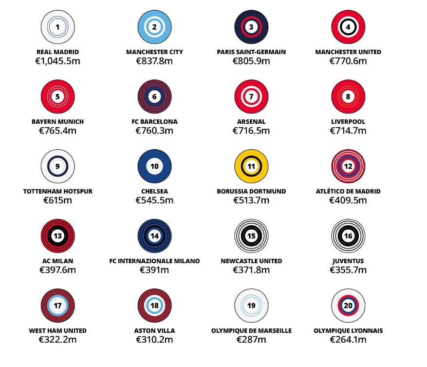 2023-2024 mövsümündə 1,05 milyard avro gəlir əldə edən "Real Madrid" keçən il olduğu kimi yenə də siyahıda 1-ci yerdə olub. Əvvəlki mövsümü 831 milyon avro ilə siyahının ilk pilləsində tamamlayan Madrid təmsilçisi gəlirini 26 faiz artıraraq bir milyard avro həddini keçib.
