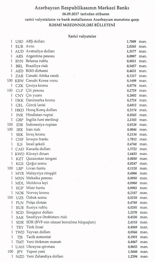 Sentyabrın 5-də rəsmi olaraq 1 dollar 1,7010 manata, 1 avro isə 2.0251 manata bərabər idi.