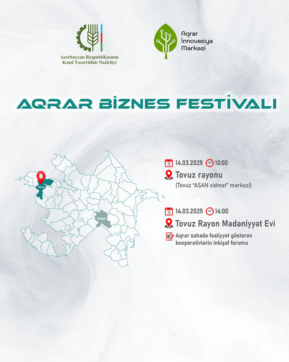Kənd Təsərrüfatı Nazirliyinin Aqrar İnnovasiya Mərkəzinin təşkilatçılığı ilə Tovuz rayonunda növbəti Aqrar Biznes Festivalı keçiriləcək. Festival martın 14-ü saat 10:00-da Tovuz “ASAN xidmət” mərkəzinin qarşısında baş tutacaq.