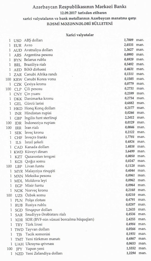 Sentyabrın 11-də rəsmi olaraq 1 dollar 1,7009 manata, 1 avro isə 2.0422 manata bərabər idi.