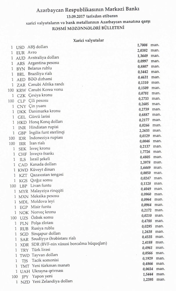 Sentyabrın 12-də rəsmi olaraq 1 dollar 1,7009 manata, 1 avro isə 2.0335 manata bərabər idi.
