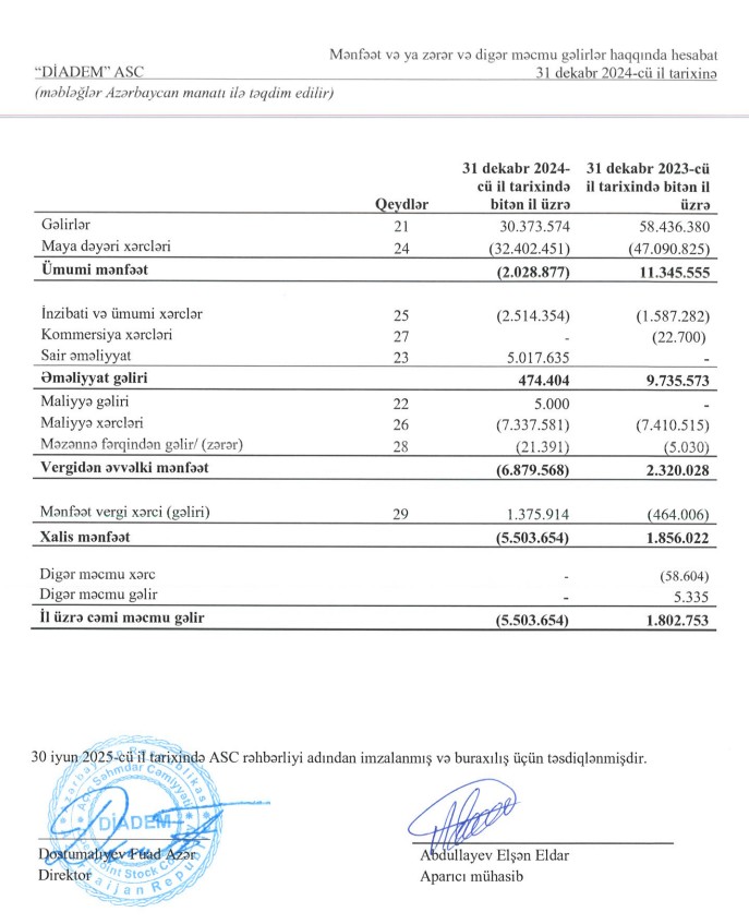 Marja.az-ın məlumatına görə, "Diadem" şirkətinin əsas əməliyyat gəlirləri 2023-cü ildə 58 milyon 436 min manat ikən, 2024-cü ildə 30 milyon 373 min manata düşüb (1,9 dəfədən çox azalıb).