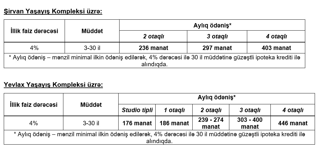 Bu elan çərçivəsində mənzillərin satışı həm ipoteka kreditindən istifadə etməklə, həm də öz vəsaiti hesabına ödəniş üsulu ilə nəzərdə tutulmuşdur.
