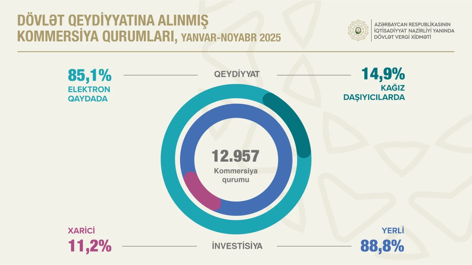 2025-ci ilin yanvar - noyabr aylarında 12 min 957 kommersiya qurumu dövlət qeydiyyatından keçib ki, onların 88,8 faizi yerli investisiyalı, 11,2 faizi xarici investisiyalıdır. Kommersiya qurumlarının 85,1 faizi elektron qaydada qeydiyyata alınıb. Yerli investisiyalı məhdud məsuliyyətli cəmiyyətlərin e-qeydiyyatının xüsusi çəkisi 96,4 faiz təşkil edib.