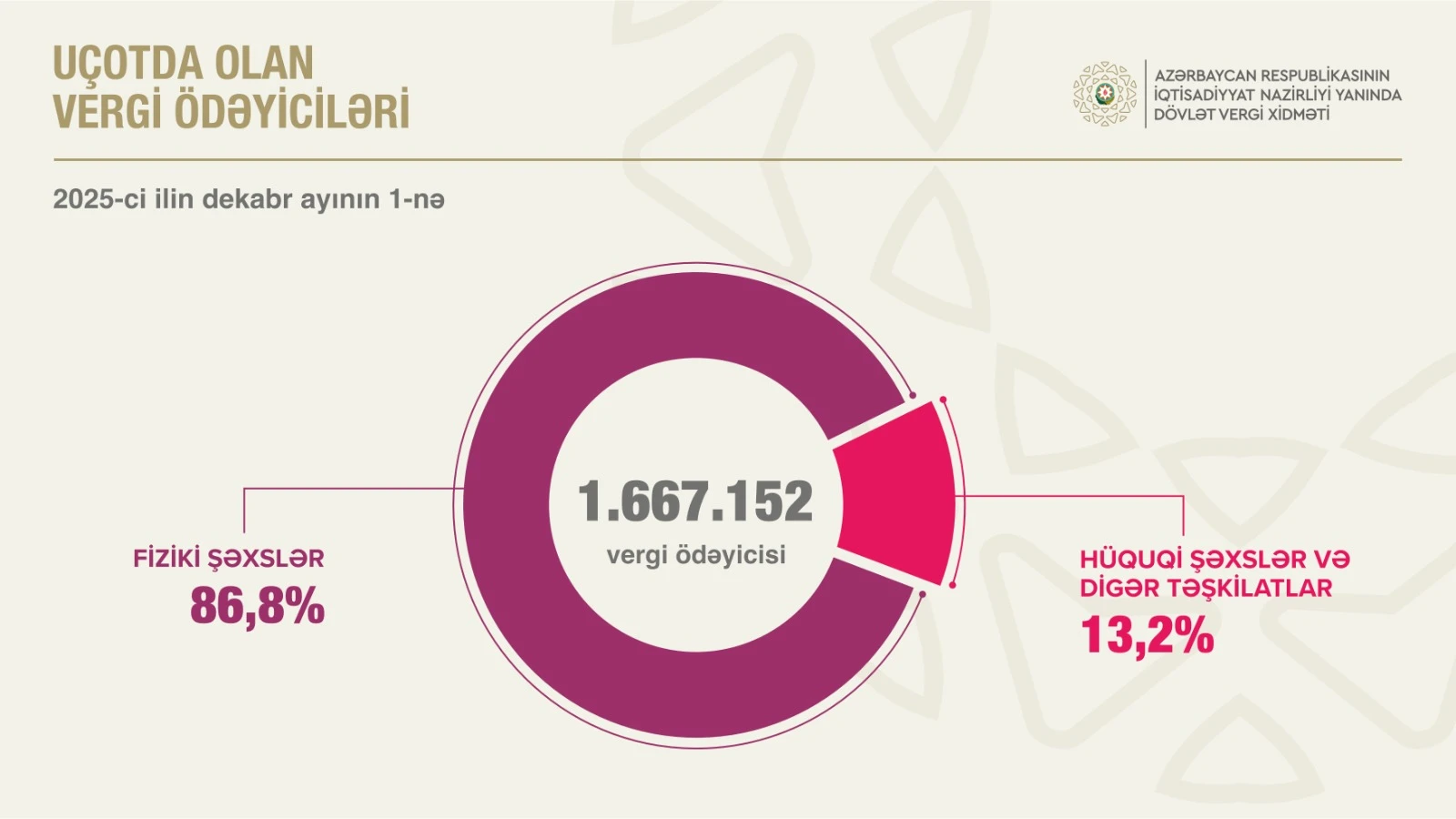 Kommersiya qurumlarının sayı 7,5 faiz artıb. 2025-ci ilin 11 ayında 13 minə yaxın şirkət dövlət qeydiyyatından keçib.2025-ci ilin dekabr ayının 1-nə Azərbaycanda uçotda olan 1 milyon 667 min 152 vergi ödəyicisinin 86,8 faizi fiziki şəxslər, 13,2 faizi hüquqi şəxslər və digər təşkilatlar olub.