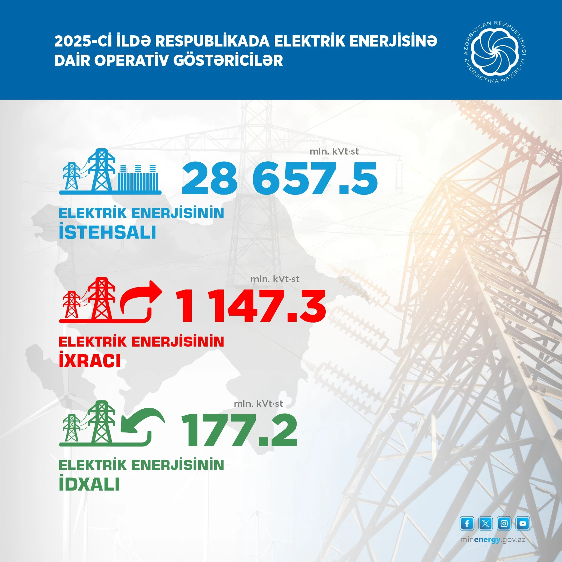 2025-ci ildə elektrik enerjisinin istehsalı “Azərenerji” ASC üzrə 25 591,8 mln. kVt·st (İES-lərdə 22 703,6 mln. kVt·st, SES-lərdə 2 827,1 mln. kVt·st, GES-lərdə 61,1 mln. kVt·st), “Azərişıq” ASC üzrə külək elektrik stansiyalarında 27,0 mln. kVt·st, müstəqil elektrik stansiyaları üzrə isə 3 038,7 mln. kVt·st təşkil edib.