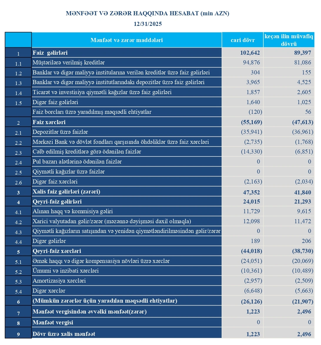 Əməliyyat gəlirlərinin artımı əsasən faiz gəlirlərinin yüksəlməsi hesabına baş verib. Faiz gəlirləri 102 milyon 642 min manata çataraq 13 milyon 245 min manat və ya 14,8 faiz artıb. Kredit portfelinin genişlənməsi və istehlak kreditlərinin artımı bu dinamikanın əsas drayverləri olub.