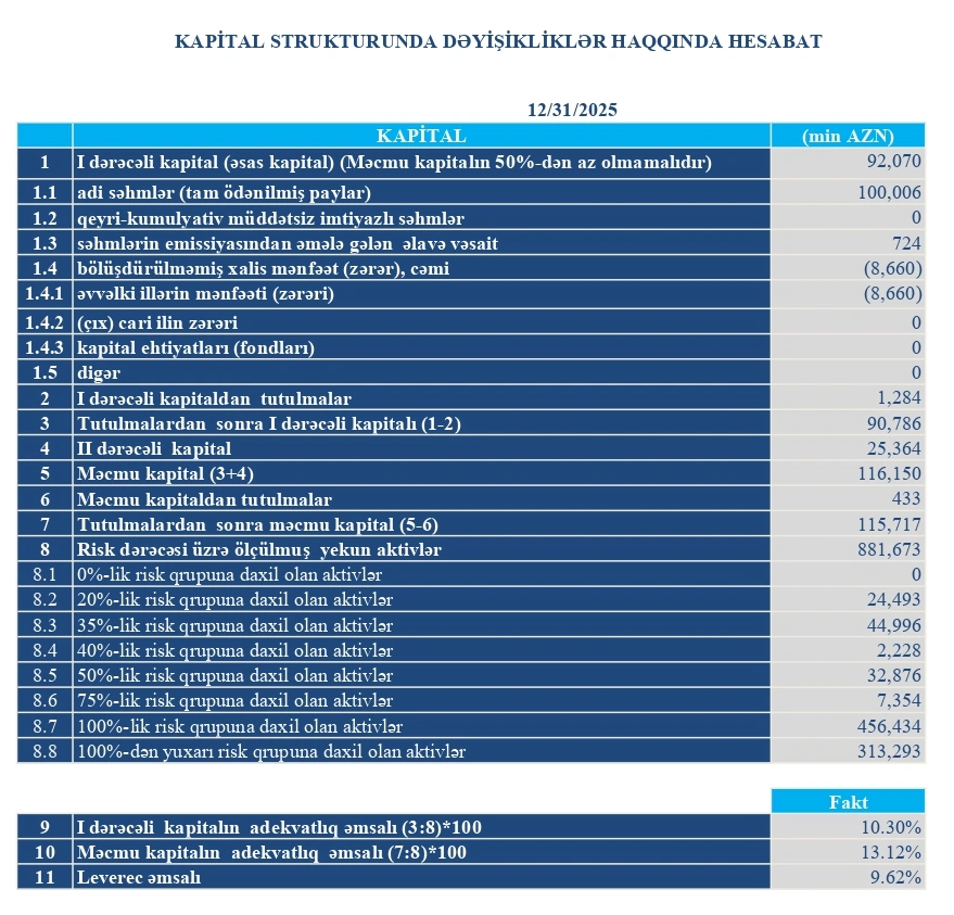 2025-ci ilin sonuna Turanbankın məcmu kapitalı 115 milyon 717 min manat təşkil edib. Bu, 2024-cü ilin sonundakı 120 milyon 562 min manatla müqayisədə 4 milyon 845 min manat və ya 4 faiz azalma deməkdir.