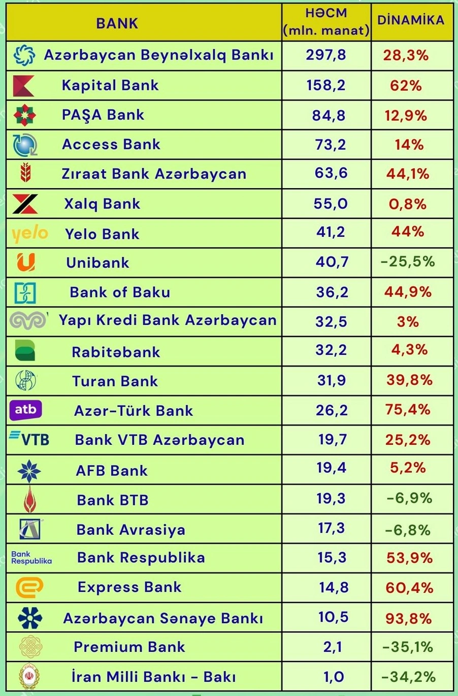 Bunlar, “Azərbaycan Beynəlxalq Bankı” (297,8 milyon manat), “Kapital Bank” (158,2 milyon manat), “PAŞA Bank” (84,8 milyon manat), “Access Bank” (73,2 milyon manat) və “Ziraat Bank Azərbaycan”dır (63,6 milyon manat).