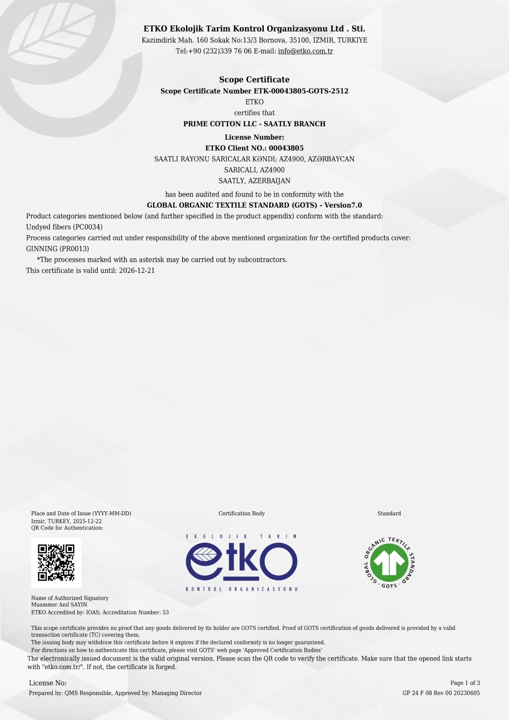 Bu sertifikatla Prime Cotton Azərbaycan pambıq sektorunda tarixi bir addım ataraq, GOTS standartı üzrə sertifikatlaşmış öncül şirkətlərdən biri kimi mövqeyini möhkəmləndirir və yerli pambığın qlobal tekstil dəyər zəncirində etibarlı, məsuliyyətli və yüksək dəyərli məhsul kimi tanınmasına mühüm töhfə verir.