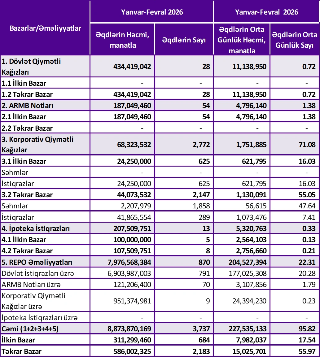 Dövriyyənin azalmasının əsas səbəbi REPO ənəliyyatları üzrə ticarət həcminin 3 milyard 964 milyon 259 min manat və ya 30,6% düşməsidir.