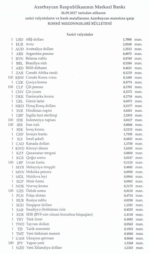 Sentyabrın 25-də rəsmi olaraq 1 dollar 1,7008 manata, 1 avro isə 2.0296 manata bərabər idi.