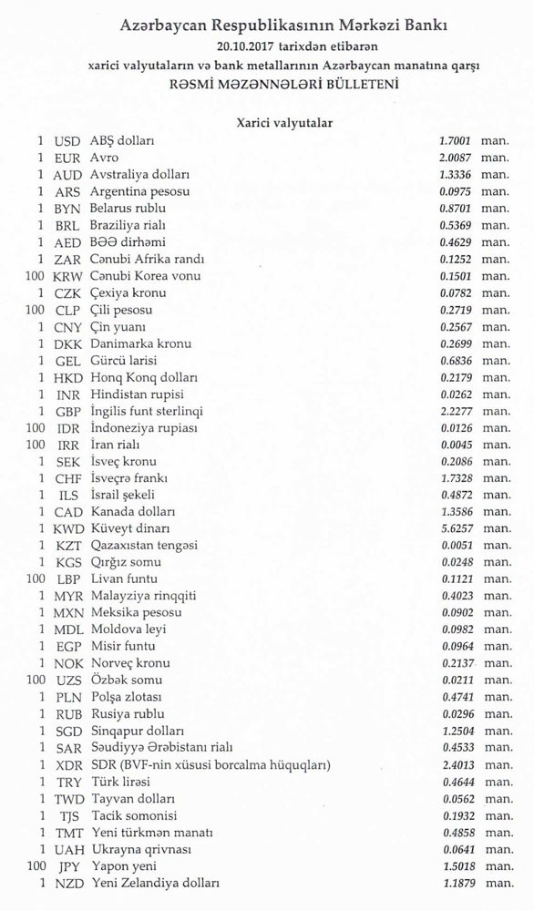 Oktyabrın 20-nə Mərkəzi Bankın açıqladığı rəsmi Dollar/manat məzənnəsi Oktyabrın 19-u ilə müqayisədə dəyişməyərək 1,7001 manat olub, Avro/manat məzənnəsi 2.0087 manata qalxıb, Rubl/manat məzənəsi isə 0,0296 manatda qalıb.