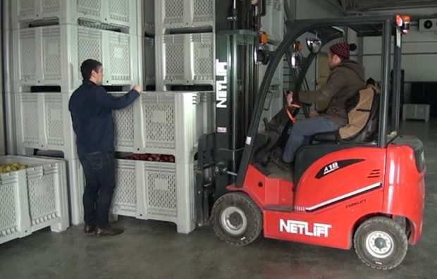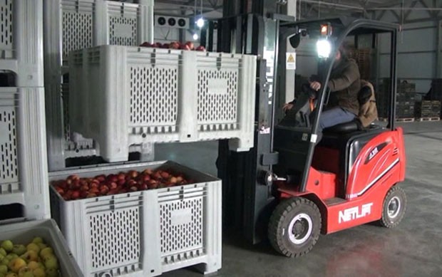Meyvə toplanan zaman cərgələr arasında kiçikqoşqulu traktor hərəkət edir. Yığılan almalar birbaşa qoşqudakı böyük plastmas taralara tökülür. Bu taralar isə soyuducu anbarlara daşınır. Meyvələr bu üsulla toplananda zədə almadığından itki də az olur.