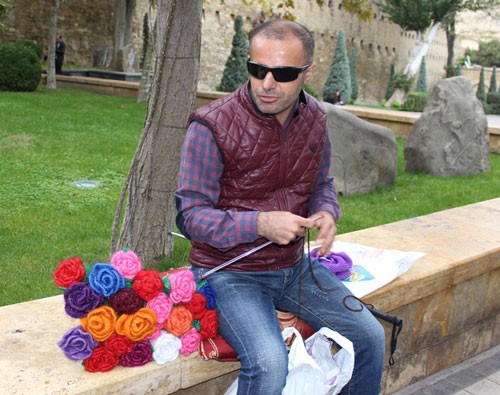 - Rəng seçimini artıq mağazada həll edirəm. Məsələn, gülün sap hissəsi yaşıl olduğu üçün satıcıdan onları ayrı qaba qoymağı xahiş edirəm. Ayrı qabda olanda artıq bilirəm ki, bu qabdakı yaşıldır. Güllərin ləçəklərini toxuyandan sonra yaşılları işləyirəm. Bilirsiniz, bunlar xırdalıqlardır və mənə görə insan çalışsa, hər şeyə nail ola bilər. Bu gün iki gözüm olmadığı halda, iynəni saplaya, telefonda mesaj yaza, çörəkpulumu, kirayə xərcimi ödəyə bilirəmsə, demək ki, hər şey insanın özündən asılıdır. Bugünkü günümə şükürlər olsun. Dövlətdən aldığım 140 manat pulun, 120 manatını kirayəyə verirəm. Burdan qazandığım isə, mənim çörək pulumdur. Bəzi satıcılar kimi reklam etmirəm. Kim istəsə gəlib alır. Bəzən almağa pulu çatmayan kimsə, imkanı yetən qədər pul qoyur ki, kömək etsin. Amma mən götürmürəm, qaytarıram. Mən dilənçi deyiləm, sədəqə yığmıram. Dəfələrlə əlimi vurmuşam ki, burda kimsə pul qoyub gedib. Əlimlə vurub həmin pulu yerə salmışam. Kiminsə puluna yaşamaq istəsəydim, bu qədər əziyyət çəkməzdim.