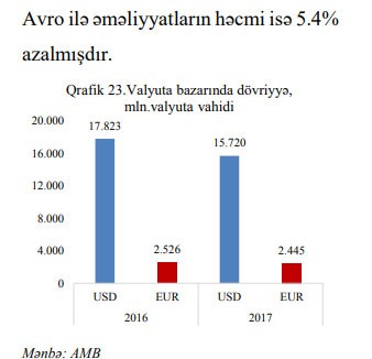 Qeyd edilib ki, 2017-ci il ərzində valyuta bazarının ümumi həcmi ötən illə müqayisədə azalmışdır. Belə ki, ötən illə müqayisədə ABŞ dolları ilə valyuta əməliyyatlarının həcmi 5.8%, Avro ilə əməliyyatların həcmi isə 5.4% azalmışdır.