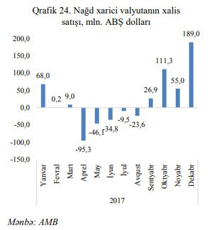 "2017-ci il ərzində manatın xarici valyutalara nəzərən məzənnəsi tədiyə balansı üzrə meyillərə uyğun formalaşmışdır. Tədiyə balansının yaxşılaşması, ixracın genişlənməsi və idxalın əvəz edilməsi siyasəti nəticəsində valyuta daxilolmalarının artması valyuta bazarında vəziyyəti sabitləşdirmişdir. Bu şəraitdə həyata keçirilən makroiqtisadi siyasət tədbirləri nəticəsində manatın ABŞ dollarına qarşı məzənnəsi 4% möhkəmlənmişdir. 2017-ci ilin ikinci rübündən manatın məzənnəsi əlavə möhkəmlənmə təzyiqləri altında olmuşdur".
