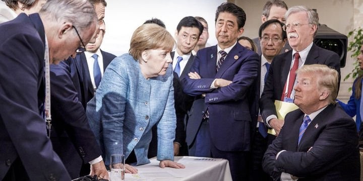 Zirvə görüşündə çəkilmiş ən yaddaqalan foto. Trampın tək qaldığı hiss olunur. Almaniyanın Baş naziri Angela Merkel, ABŞ Prezidenti Donald Tramp ilə ciddi fikir ayrılıqlarının olduğunu deyib.
