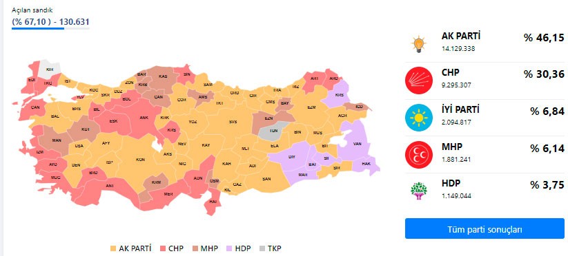 Həmçinin səslərin 52.29%-ni "Cumhur" ittifaqı (AK PARTİ, MHP), 37.20%-ni "Millet" ittifaqı (CHP, İYİ PARTİ) toplayıb.