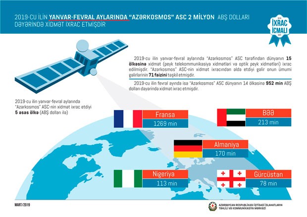 2019-cu ilin fevral ayında isə “Azərkosmos” ASC dünyanın 14 ölkəsinə 952 min ABŞ dolları dəyərində xidmət ixrac edib.