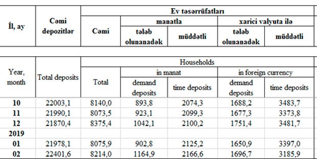 Fevralın sonunda cəmi depozit və əmanətlərin 8 milyard 214 milyon manatı ev təsərrüfatlarına, 1 milyard 534 milyon manatı maliyyə təşkilatlarına, 12 milyard 653 milyon manatı qeyri-maliyyə təşkilatlarına məxsus olub.