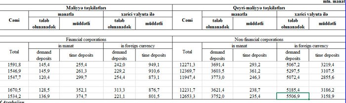 Ev təsərrüfatlarına məxsus 8 milyard 214 milyon manat əmanətin 4 milyard 888,2 milyon manatı və ya 59,4%-i, qeyri-maliyyə təşkilatlarının 12 milyard 653 milyon manat depozitinin 68,5%-i və ya 8 milyard 666 milyon manatı, maliyyə təşkilatlarının 1 milyard 534 milyon manat depozitinin isə 66,6%-i və ya 1 milyard 22 milyon manatı xarici valyuta ilə yerləşdirilib.