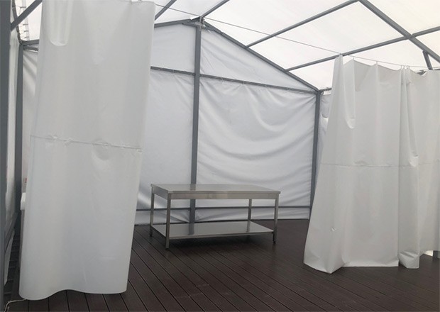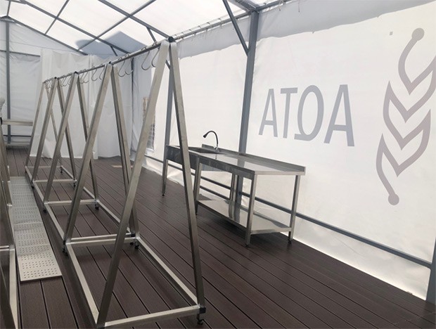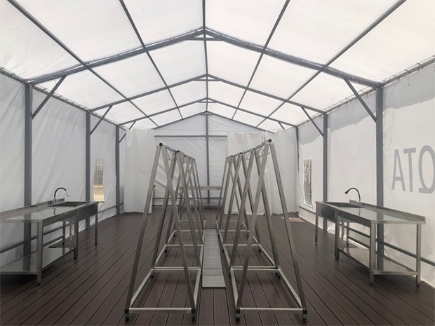Çadırtipli kəsim məntəqələri dezinfeksiya oluna bilən, tozun qarşısını alan xüsusi materialdan hazırlanıb. Məntəqənin daxili döşəməsi drenaj sistemi ilə təmin edilib ki, bu da kəsim zamanı heyvanın qanı və digər axıntıların kanalizasiya vasitəsilə kənarlaşdırılmasına, nəticədə ətraf ərazilərin çirklənməsinin qarşısının alınmasına imkan verəcək. Çadırtipli kəsim məntəqələri heyvanın kəsilməsi, soyulması və doğranmasına qədər bütün prosesi həyata keçirmək üçün paslanmayan metallardan hazırlanan, gigiyenik tələblərə uyğun lazımı avadanlıqlarla təchiz edilib.