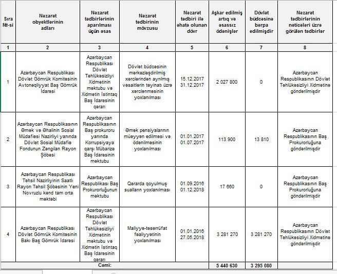 Xəbər verdiymiz kimi, 2019-cu ilin birinci yarısında Dövlət Maliyyə Nəzarəti Xidmətinin mütəxəssisləri tərəfindən hüquq-mühafizə və prokurorluq orqanlarının məktublarına, məhkəmələrin qərarlarına əsasən 4 təşkilatda (adları aşağıdakı cədvəldə göstərilib) aparılmış yoxlamalarla 5 milyon 440,63 min manat məbləğində artıq və əsassız ödənişlər aşkar edilib, təqsirkar şəxslər hesabına həmin vəsaitin 3 milyon 295,08 min manatının bərpası təmin olunub, müvafiq sənədlər aidiyyəti üzrə təqdim edilib.