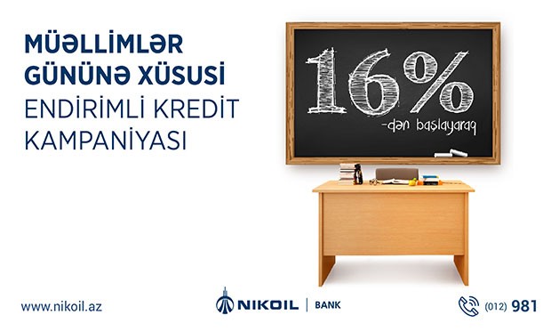 Nikoil Bank əziz müəllimlərimizi düşünərək müəllimlərin peşə bayramı günü münasibətilə yalnız müəllimlərə və təhsil sahəsində çalışan şəxslərə kredit kampaniyasını təqdim edir. 30 sentyabr-11 oktyabr 2019-cu il tarixlərini əhatə edən kampaniya çərçivəsində 16%-dən başlayaraq, 48 aya, 30.000 AZN-dək Nağd Pul Kreditini 0% KOMİSSİYA ilə əldə etmək mümkündür.