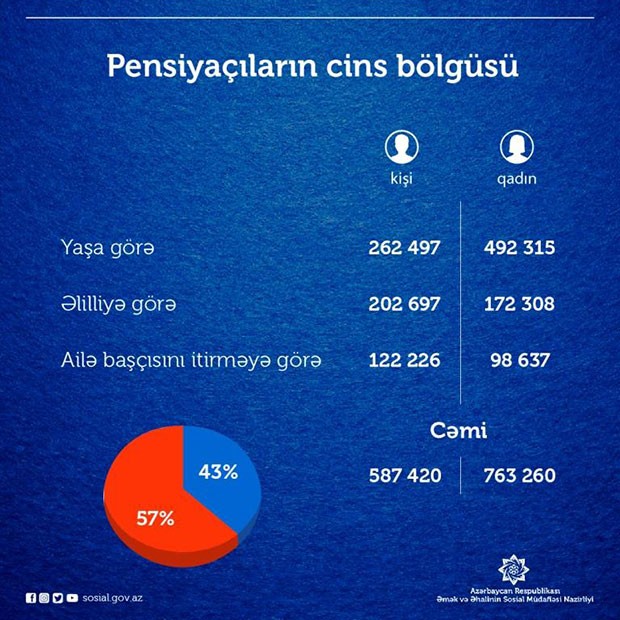 O cümlədən, yaşa görə pensiyaçıların 492 315 nəfərini qadınlar və 262 497 nəfərini kişilər, əlilliyə görə pensiya alanların 172 308 nəfərini qadınlar və 202 697 nəfərini kişilər, ailə başçısını itirməyə görə pensiya alanların 98 637 nəfərini qadınlar və 122 226 nəfərini kişilər təşkil edir.