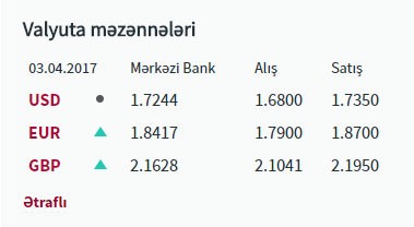 NBC Bank alışı 1.72 manatdan 1.7150 manata, satışı isə 1.7440 manatdan 1.7350 manata, Yapı Kredi Bank Azərbaycan alışı 1.71 manatdan 1.7050 manat, satışı isə 1.75 manatdan 1.74 manata endirib.