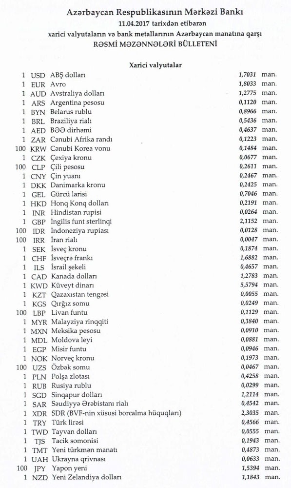 Aprelin 11-nə Mərkəzi Bankın açıqladığı rəsmi Dollar/manat məzənnəsi Aprelin 10-u ilə müqayisədə dəyişməyərək 1,7031 manat olub, Avro/manat məzənnəsi isə 1.8033 manata qalxıb.