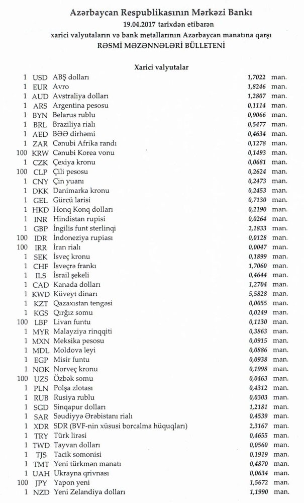 Aprelin 18-də rəsmi olaraq 1 dollar 1,7026 manata, 1 avro isə 1.8124 manata bərabər idi.