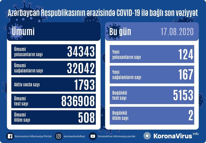 Son 24 saatda Azərbaycan Respublikasında koronavirus (COVID-19) infeksiyasına 124 yeni yoluxma faktı qeydə alınıb, 167 nəfər müalicə olunaraq sağalıb və evə buraxılıb.