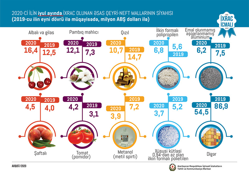 2020-cu ilin iyul ayında qeyri-neft sektoru üzrə ixracda albalı və gilas (16,4 milyon ABŞ dolları) birinci, pambıq mahlıcı (12,1 milyon ABŞ dolları), qızıl (sikkə kəsilməsində istifadə olunmayan, digər emal olunmamış formalarda – 10,7 milyon ABŞ dolları) üçüncü yerdə qərarlaşıb.