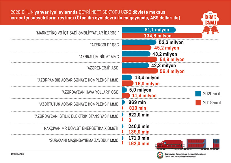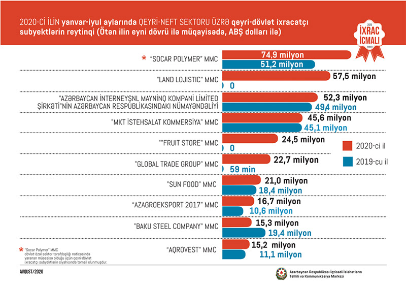 Marja xəbər verir ki, “İxrac İcmalı”nın avqust sayında qeyri-neft sektoru üzrə əsas ixracatçı şirkətlərin reytinqi verilib. 2020-ci ilin 7 ayı üzrə hazırlanan qeyri-dövlət ixracatçı subyektlərin reytinqində ilk onluqda aşağıdakı şirkətlər təmsil olunurlar: “Socar Polymer” MMC, "Land Lojistic" MMC, "Azərbaycan İnterneyşnl Mayninq Kompani Limited Şirkəti"nin Azərbaycan Respublikasındakı nümayəndəliyi, "MKT İstehsalat Kommersiya" MMC, "Fruit Store" MMC, "Global Trade Group" MMC, "Sun Food" MMC, “Azagroeksport 2017” MMC, "Baku Steel Company", "Aqrovest" MMC.