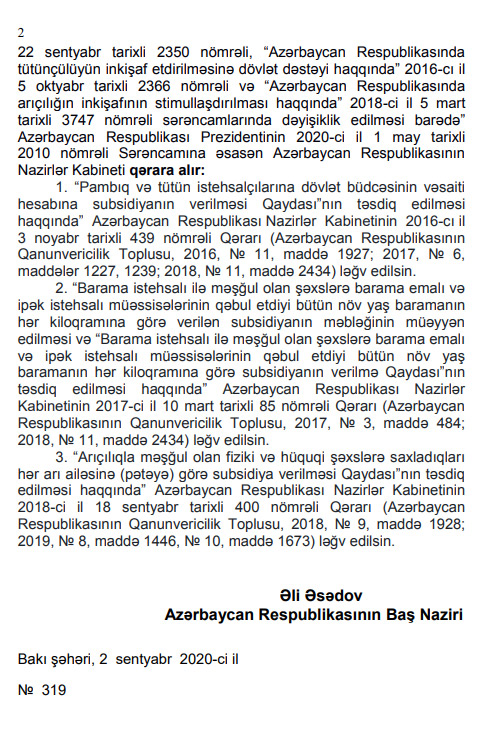 Baş Nazir Əli Əsədov imzaladığı qərar ilə pambıq, tütün, barama və bal istehsalçılarına subsidiyanın verilməsi qaydalarını ləğv edib.