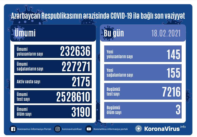 Azərbaycanda bu gün koronavirus infeksiyasına 145 yeni yoluxma faktı qeydə alınıb, 155 nəfər müalicə olunaraq sağalıb və evə buraxılıb.