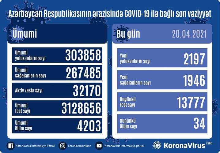 Azərbaycan Respublikasında koronavirus (COVID-19) infeksiyasına 2197 yeni yoluxma faktı qeydə alınıb, 1946 nəfər müalicə olunaraq sağalıb.
