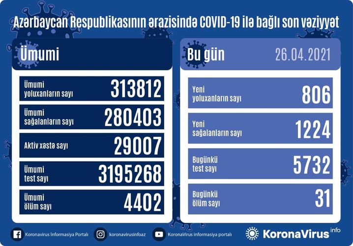 Azərbaycan Respublikasında koronavirus (COVID-19) infeksiyasına 806 yeni yoluxma faktı qeydə alınıb, 1224 nəfər müalicə olunaraq sağalıb.