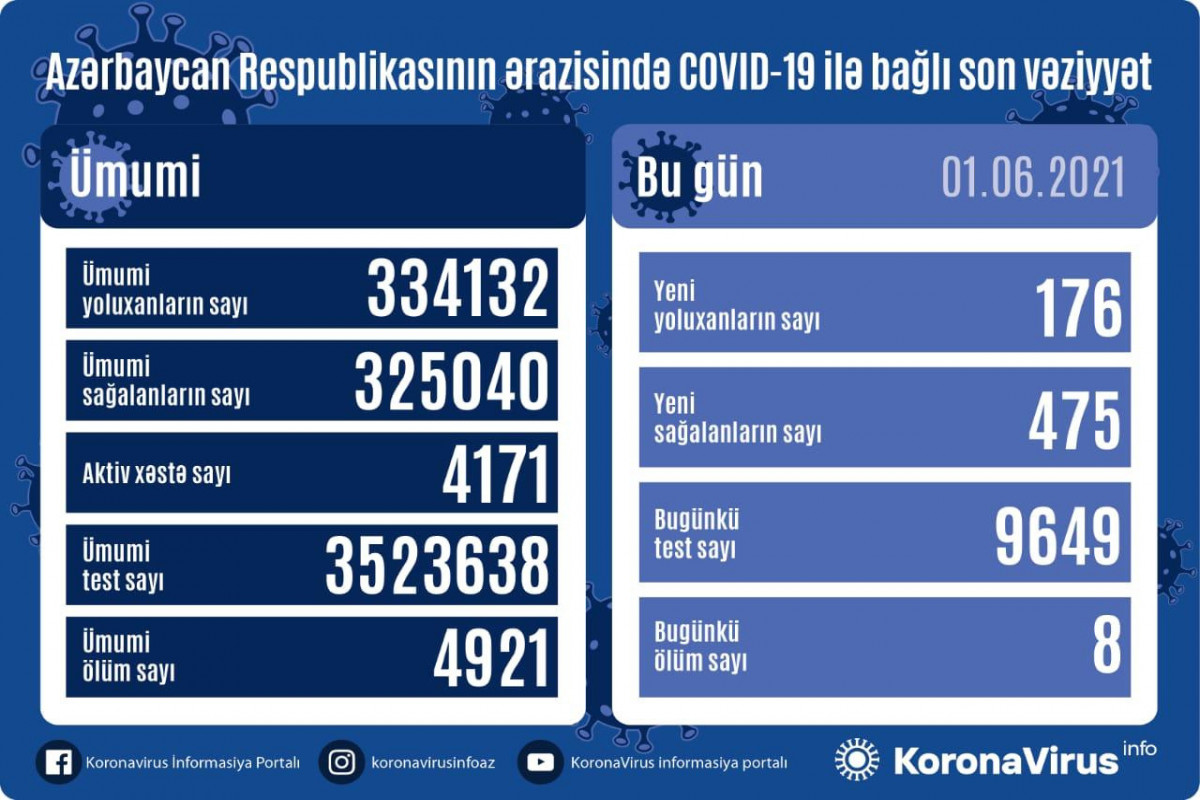 Azərbaycan Respublikasında koronavirus (COVID-19) infeksiyasına 176 yeni yoluxma faktı qeydə alınıb, 475 nəfər müalicə olunaraq sağalıb.