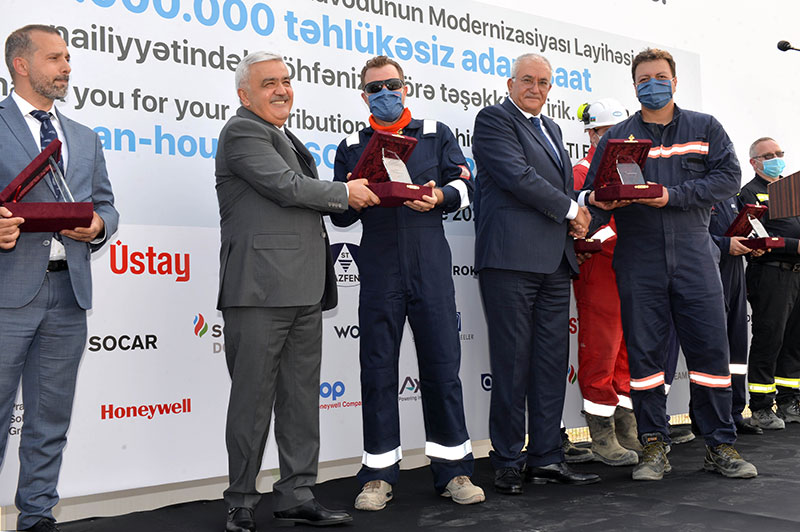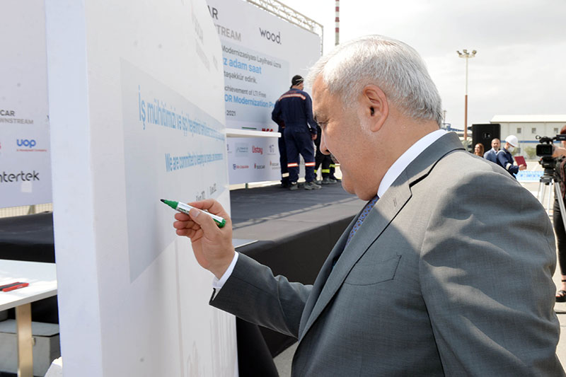 Tədbirdə çıxış edən SOCAR-ın prezidenti Rövnəq Abdullayev qeyd etmişdir ki, zavodun davamlı istismarını və AVRO-5 standartına cavab verən yanacaq məhsulları istehsalını təmin etmək məqsədi daşıyan modernizasiya və yenidənqurma layihəsi miqyas etibarilə nəhəng olmaqla yanaşı, həm də öz mürəkkəbliyi ilə fərqlənir: “Bu layihə gündəlik fəaliyyətini davam etdirən, strateji əhəmiyyətli məhsullar istehsal edən və yanğın-partlayış təhlükəli xüsusi diqqət tələb edən bir zavod təsərrüfatının ərazisində həyata keçirilir. Belə bir mürəkkəb iş şəraitində çalışmaq, əlbəttə ki, bizdən ikiqat diqqət və əzmkarlıq tələb edir. Bu mənada layihə çərçivəsində 25 milyon qəzasız adam-saat həcmində işin görülməsi uğurlu nəticədir. Müqayisə üçün deyim ki, bu, bir neçə il öncə tikilmiş “SOCAR Polymer” kompleksi və ya Karbamid zavodunun inşasına sərf edilmiş iş həcmindən çoxdur. Bu göstərici SOCAR-da əməyin təhlükəsizliyi məsələsinə verilən önəmin, uğurlu SƏTƏMM siyasətinin parlaq təzahürüdür”.