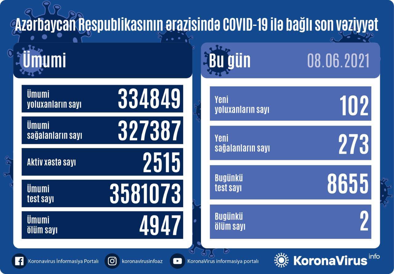 Azərbaycan Respublikasında koronavirus (COVID-19) infeksiyasına 102 yeni yoluxma faktı qeydə alınıb, 273 nəfər müalicə olunaraq sağalıb.