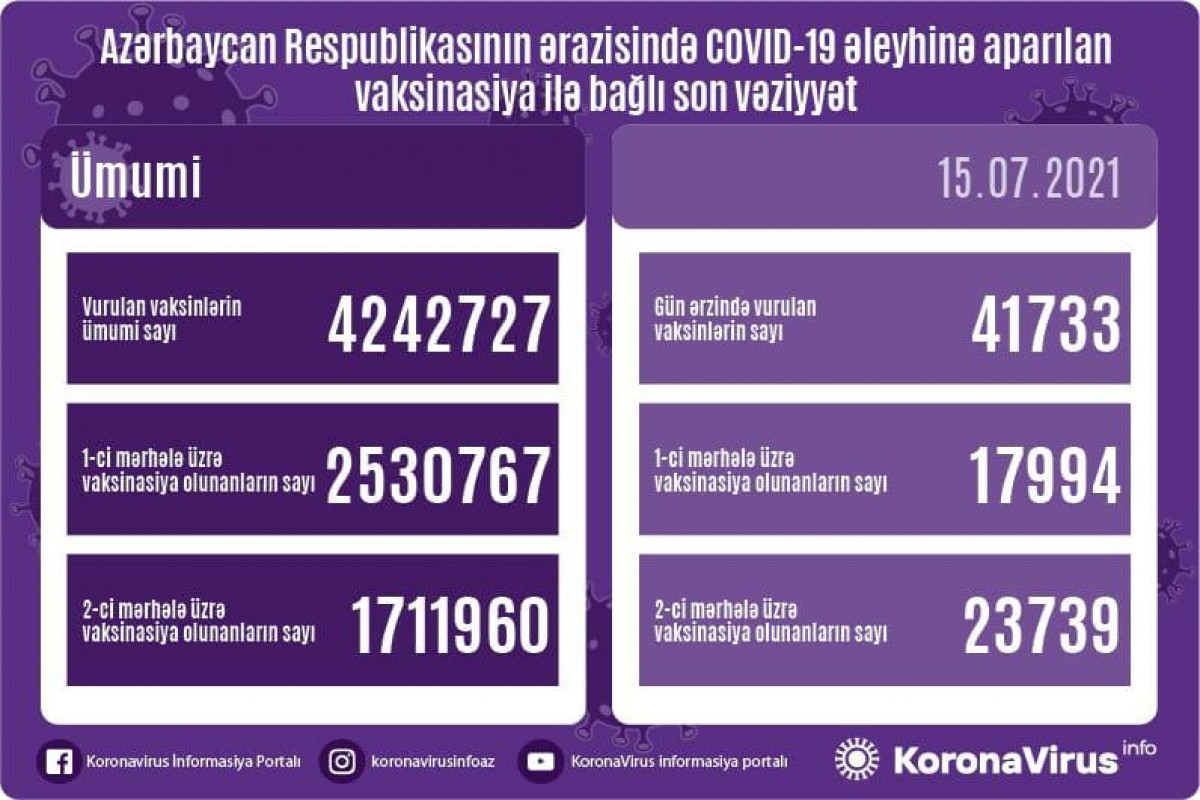 Azərbaycanda son sutkada koronavirus (COVID-19) əleyhinə 41 733 vaksin vurulub.
