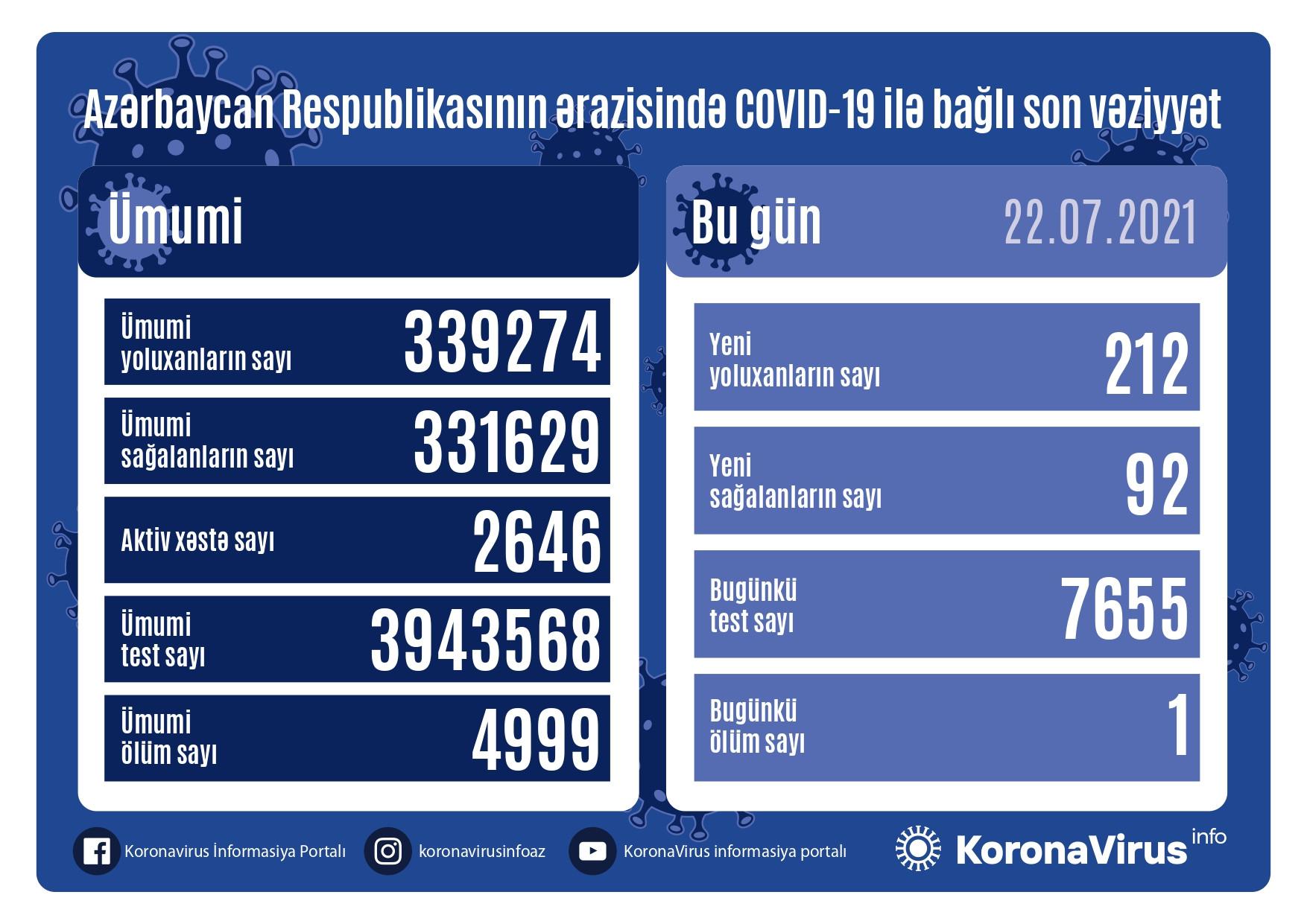 Azərbaycanda koronavirus (COVID-19) infeksiyasına 212 yeni yoluxma faktı qeydə alınıb, 92 nəfər müalicə olunaraq sağalıb.
