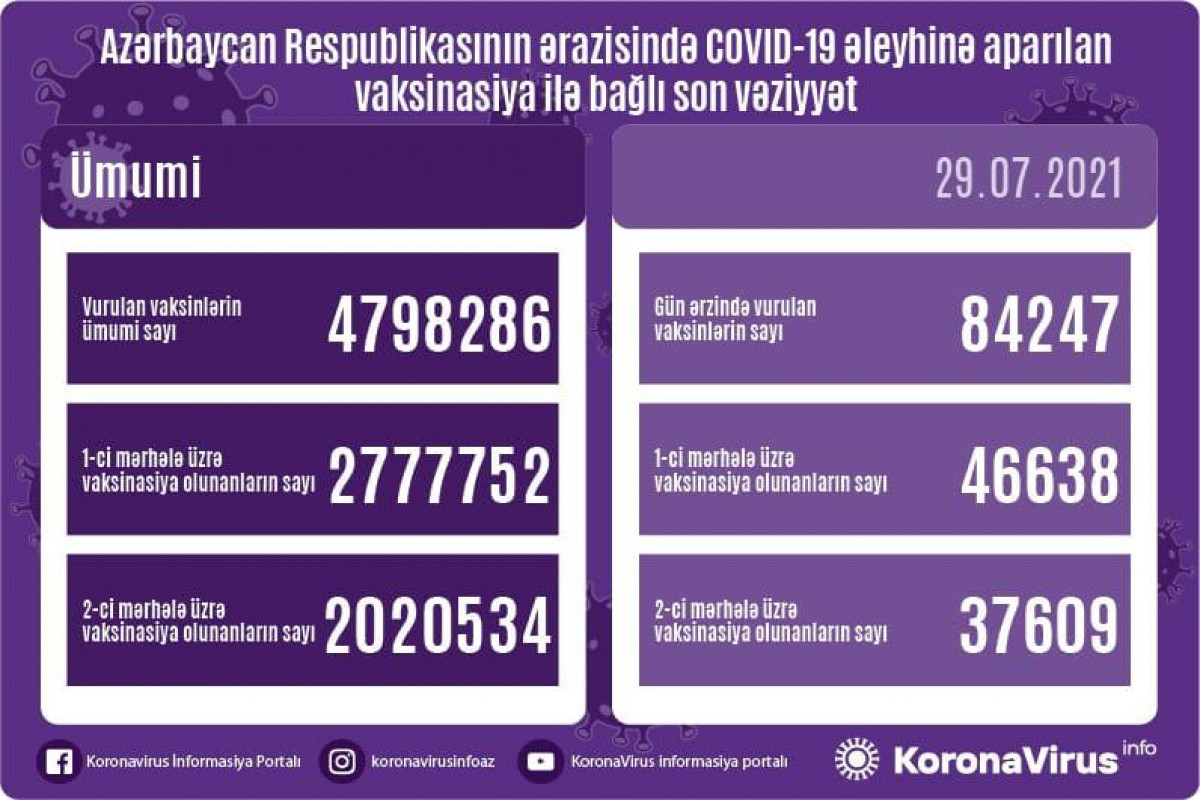 Ölkədə vurulan vaksinlərin ümumi sayı 4798286, birinci mərhələ üzrə vaksinasiya olunanların ümumi sayı 2777752, ikinci mərhələ üzrə vaksinasiya olunanların sayı isə 2020534 təşkil edir.