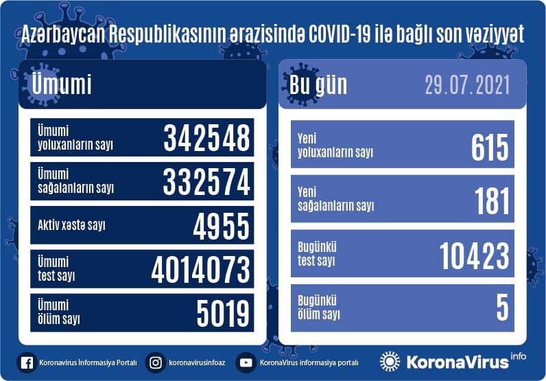 Azərbaycanda koronavirus (COVID-19) infeksiyasına 615 yeni yoluxma faktı qeydə alınıb, 181 nəfər müalicə olunaraq sağalıb.
