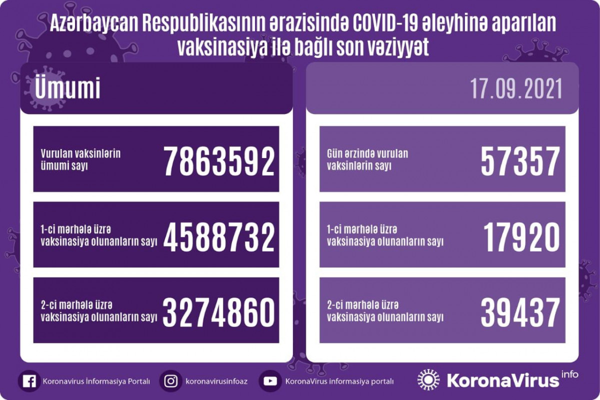 Ölkədə vurulan vaksinlərin ümumi sayı 7863592, birinci mərhələ üzrə vaksinasiya olunanların ümumi sayı 4588732, ikinci mərhələ üzrə vaksinasiya olunanların sayı isə 3274860 təşkil edir.