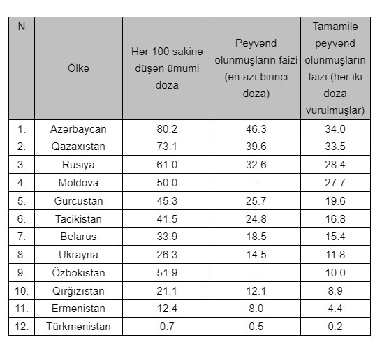 Azərbaycan vaksinasiyanın səviyyəsinə görə MDB məkanında liderdir.