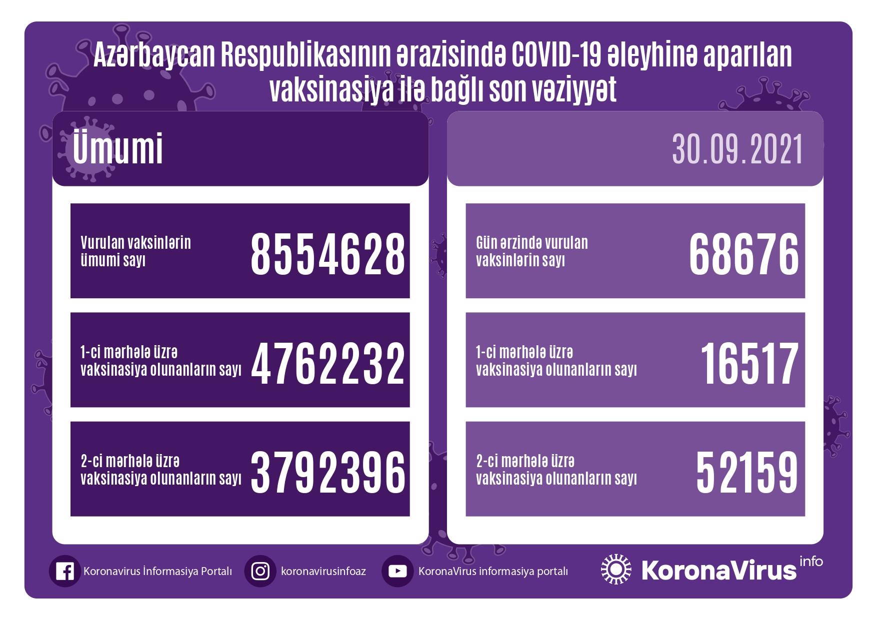 Azərbaycanda son sutkada koronavirus (COVID-19) əleyhinə 68 676 vaksin vurulub. Bir gündə birinci mərhələ üzrə vaksinasiya olunanların sayı 16517, ikinci mərhələ üzrə vaksinasiya olunanların sayı 52 159 nəfərdir.